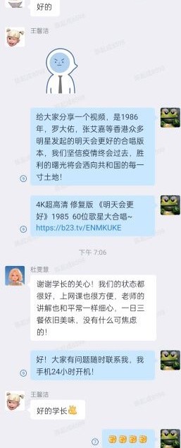 同时,通过48个“云班级”互动活动,每个同学都能在这里尽情地展示自我风采。云班级搭建后,大家积极分享自己的生活,一首歌、一个短视频、一个小故事让云班级的成员随时随刻感受到快乐。一些“云班级”也开展了“云饭菜”分享。同学们也在“云班级”中提出自己的一些疑惑和担忧,有同学会苦恼自己无法适应线上课程,一些同学会帮助指导,给予自己的经验。对于一些不良情绪,大家也互相安慰和疏导。临近毕业的大四学子在“云班级”中对于未来的规划相互交流,虽然一些同学考研失利,但是通过大家各方面的鼓励以及一些同学的出谋划策,很多同学打开新思路,重拾信心开始职业规划旅程。虽然大家远隔千里,但是在云班级中可以感受到彼此的存在。