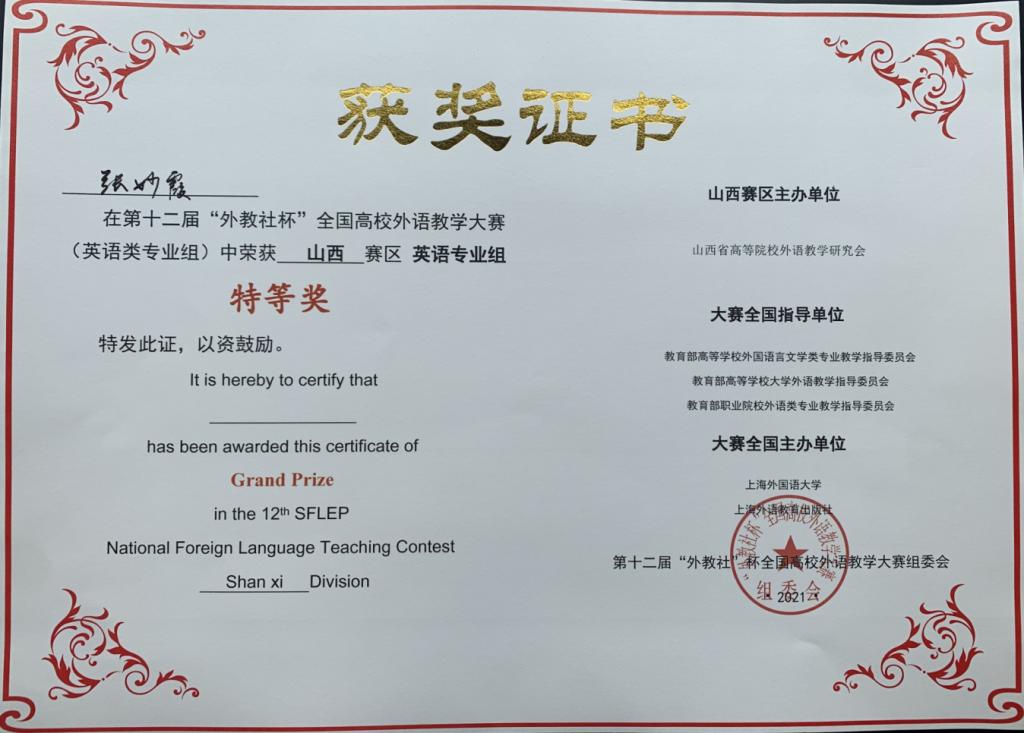 10月12日,我院教师张妙霞在第十二届“外教社杯”全国高校外语教学大赛(英语类专业组)中荣获山西分赛区特等奖。山西分赛区比赛由山西省高等院校外语教学研究会和上海外语教育出版社联合主办,历经初赛、复赛、决赛,经过激烈角逐,张妙霞老师脱颖而出,荣获英语专业组特等奖,获得代表山西省参加全国决赛阶段比赛的唯一名额。