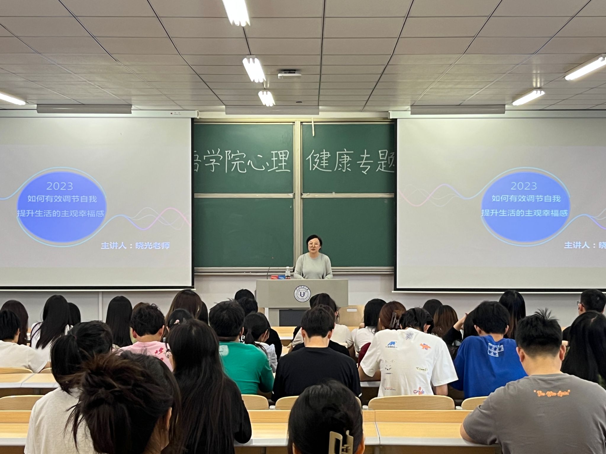 为迎接“5·25”全国中大学生心理健康日,进一步加强我院学生心理健康教育,关注学生的心理健康和心灵成长,2023年5月17日下午,我院特邀国家二级心理咨询师王晓光在XGD-102教室举办了“如何有效调节自我,提升生活的主观幸福感”的专题报告。各班心理委员、学生会干部以及学生代表等180余人聆听报告。